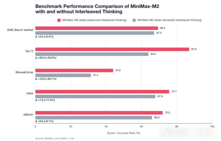 MiniMax M2的发布数据中,有一组数据有劲诠释了这一机制的成果。