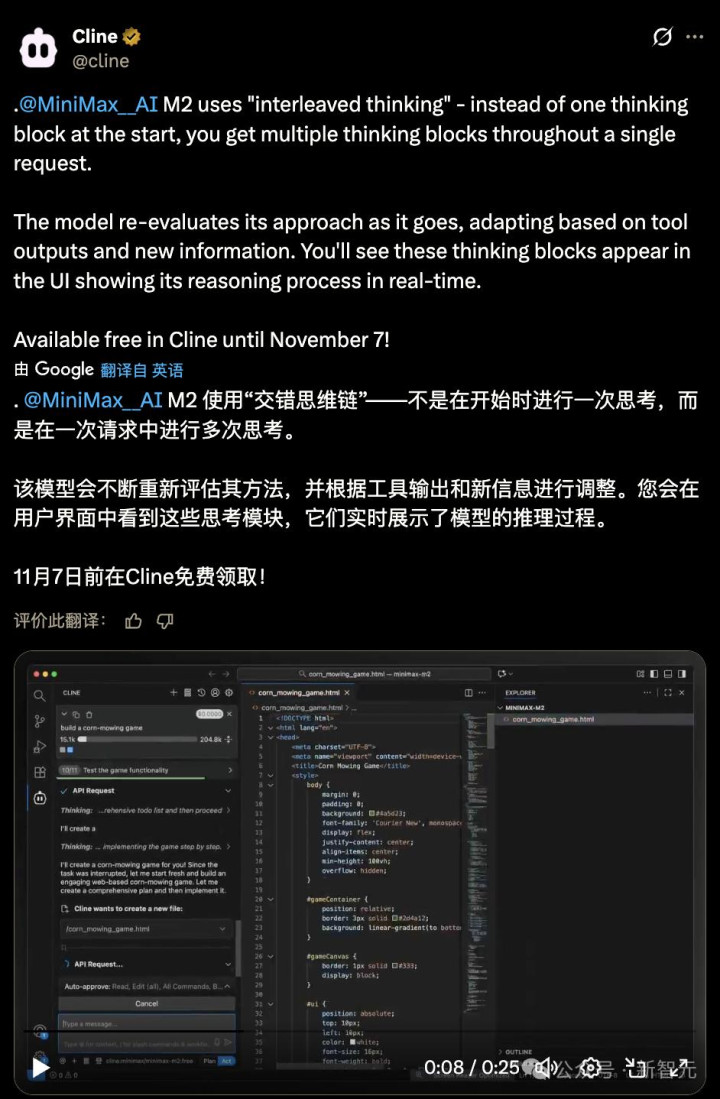 Cline:这是VS Code上最火的AI编程插件之一。MiniMax团队与其精良互助,修改了底层的音讯处理逻辑,确保在IDE的对话历史中,不仅保留代码,还保留模子的念念考过程。这径直让M2在Cline里的进展从「不可用」变成了「丝滑」。