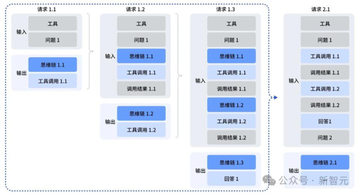 如图所示,交错念念维链即模子在推理(thinking)和器具调用(action)之间往返轮换,并执续保留和复用每一轮的推理状况,从而达成平定、可积贮的长程运筹帷幄。