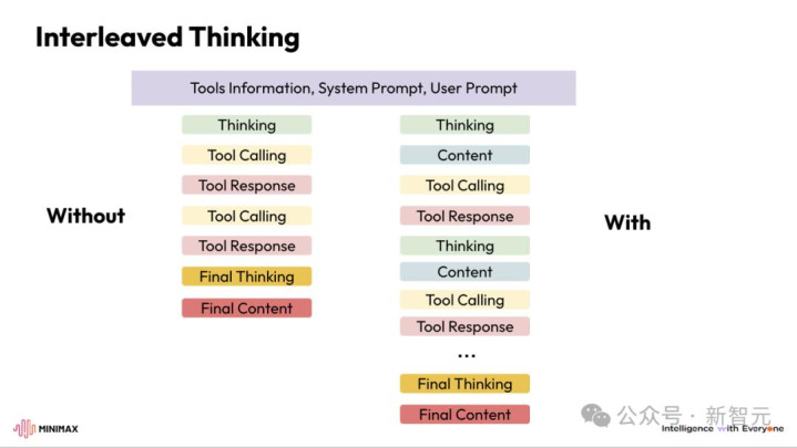 MiniMax等部分厂商也将其称作Interleaved Thinking(交错念念维链),从暗示图即可看出,二者实质上是等价的。这是一个更靠近时期的称号。