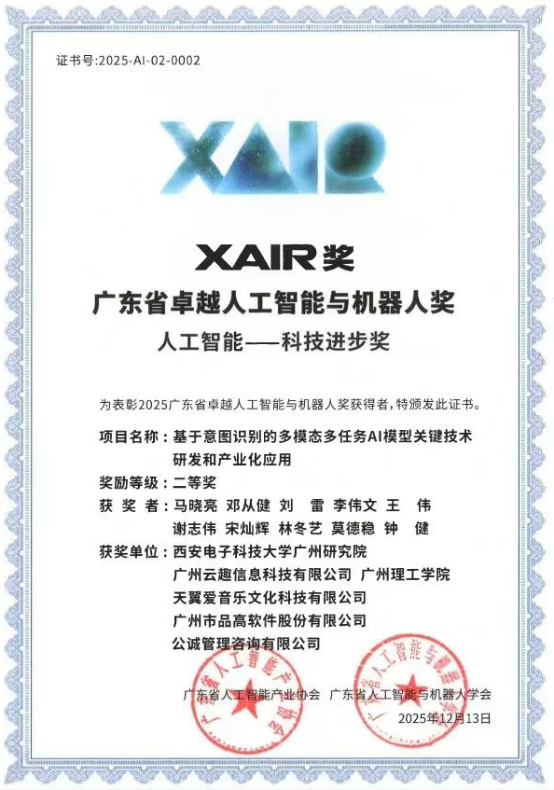 上证报中国证券网讯(记者王子霖)据品高股份官方公众号12月22日音讯,近日,由品高股份集中西安电子科技大学广州策划院、广州云趣信息科技有限公司、广州理工学院、天翼爱音乐文化科技有限公司、公诚管制商榷有限公司等单元共同呈文的《基于意图识别的多模态多任务AI模子关节时期研发和产业化利用》名堂,荣获2025年度XAIR奖“东谈主工智能——科技卓著奖”二等奖。