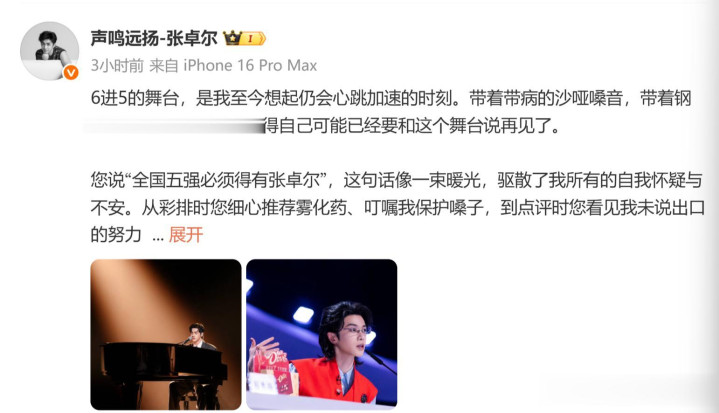 不得不说,《声鸣远扬》赛场上的张卓尔,高的不是“唱商”,而是情商。今天他写给华晨宇的心里话,让东说念主至心陈赞他的情商是真得高。