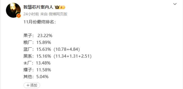 11月国内手机市集最终排行出炉: 米OV三家出入仅1%