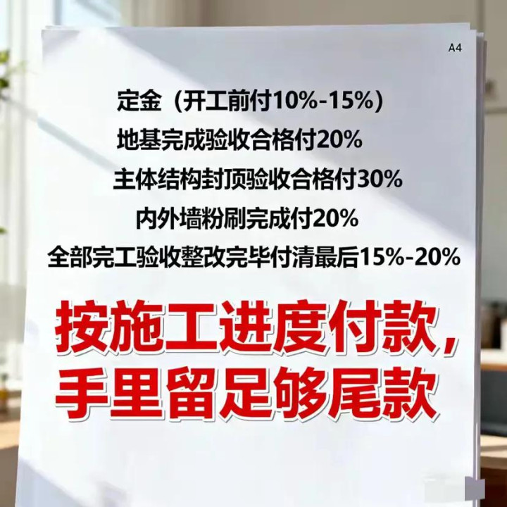 付款是制约领班的要害,许多老乡刚开工就付了泰半工程款,效指导班拿到钱后颓靡施工,甚而卷款跑路。正确的付款阵势是按施工进程分期付款,每一笔付款王人和施工节点挂钩,还得预留质保金,具体可分这五步: